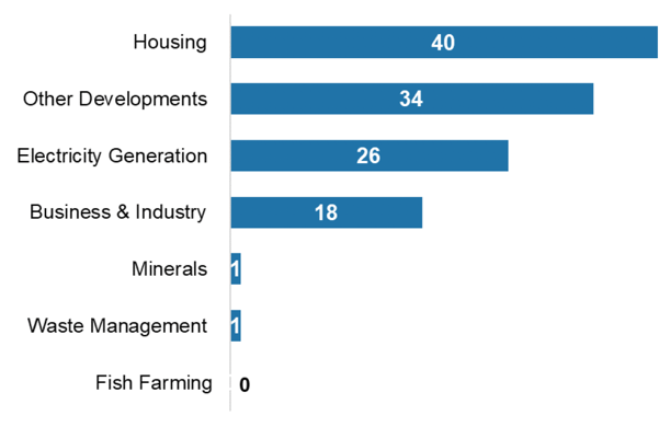 Major developments include applications for developments of housing (50 or more homes or large sites where the main use is for housing), as well as other applications covering areas of development such as minerals, business & industry, waste management, electricity generation, freshwater fish farming, marine finfish farming, marine shellfish farming and other developments.