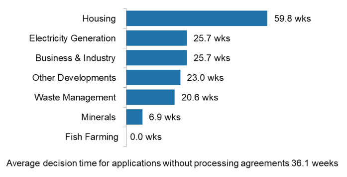 There were 37 major housing development applications with processing agreements, almost a half (48.6%) of these met agreed timescales that had been set between developers and local authorities.