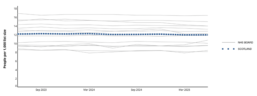 The NTI portal identifies where GP practices, clusters or health boards are in relation to key prescribing indicators for polypharmacy. The three-point timeline allows benchmarking of cluster or health board region against similar clusters, or the Scottish average, in a range of prescribing areas. Practices can compare their data to others in the cluster or similar practices to help account for demographic or regional variation in practice. A new dashboard view is also available, providing additional context such as demographics and prevalence.