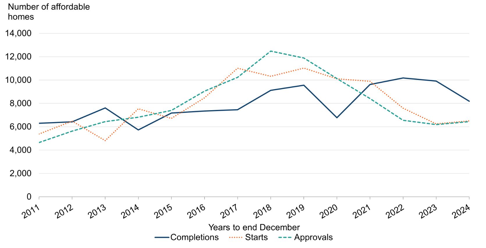 Chart 6: Affordable Housing Supply Programme, housing completions, starts, and approvals, 2011 to 2024 (year to end December)