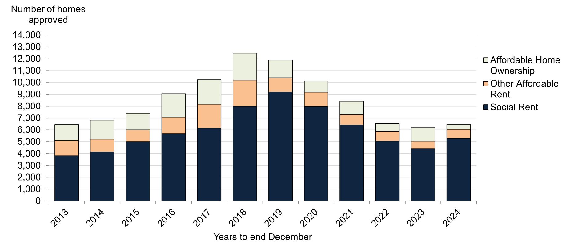 Chart 7: Affordable housing supply approvals by type, 2013 to 2024 (year to end of December)