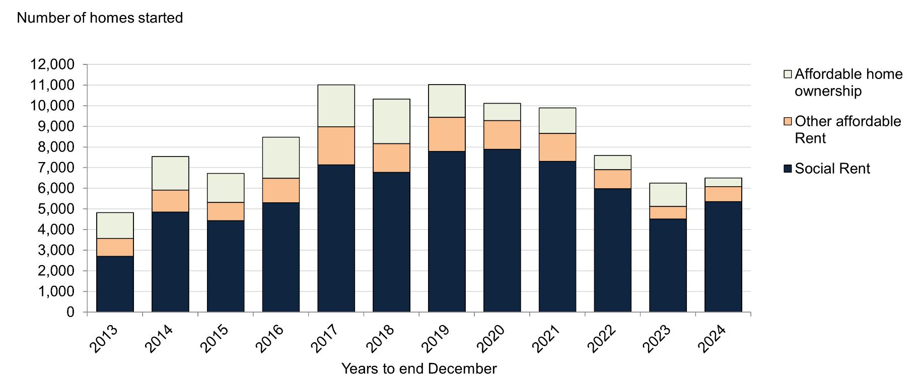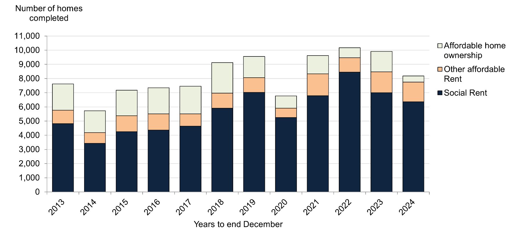 Comparing the year to the end of December 2024 to the previous year, there was a decrease in the number of homes completed for affordable home ownership (-70%, -1,016 homes), social rent (-9%; -636 homes) and other affordable rent (-6%, -84 homes).