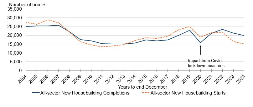 New build house completions and starts decreased between 2023 and 2024 (year to end December), as Chart 1 indicates. New housebuilding completions and starts decreased by 7% (-1,441 homes) and 9% (-1,538 homes) respectively.