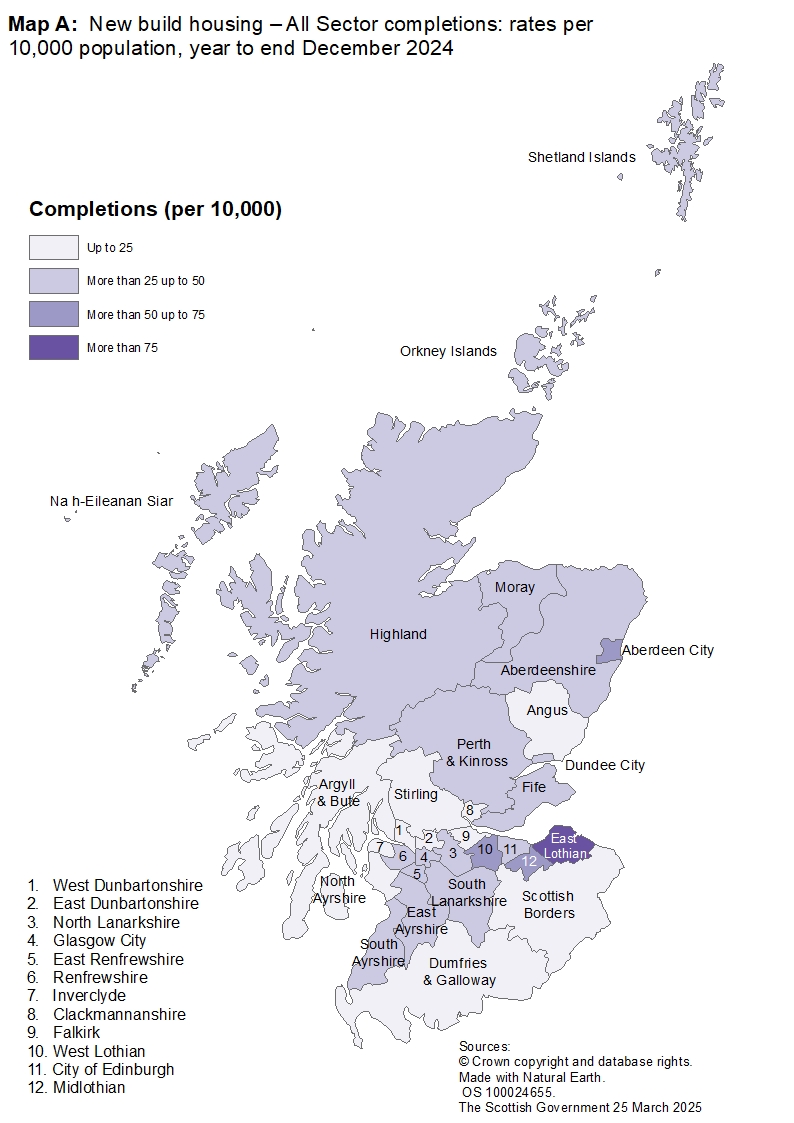 Map A shows that in the year to the end of December 2024, the highest new build rate was in East Lothian which had rates of more than 75 homes completed per 10,000 population.