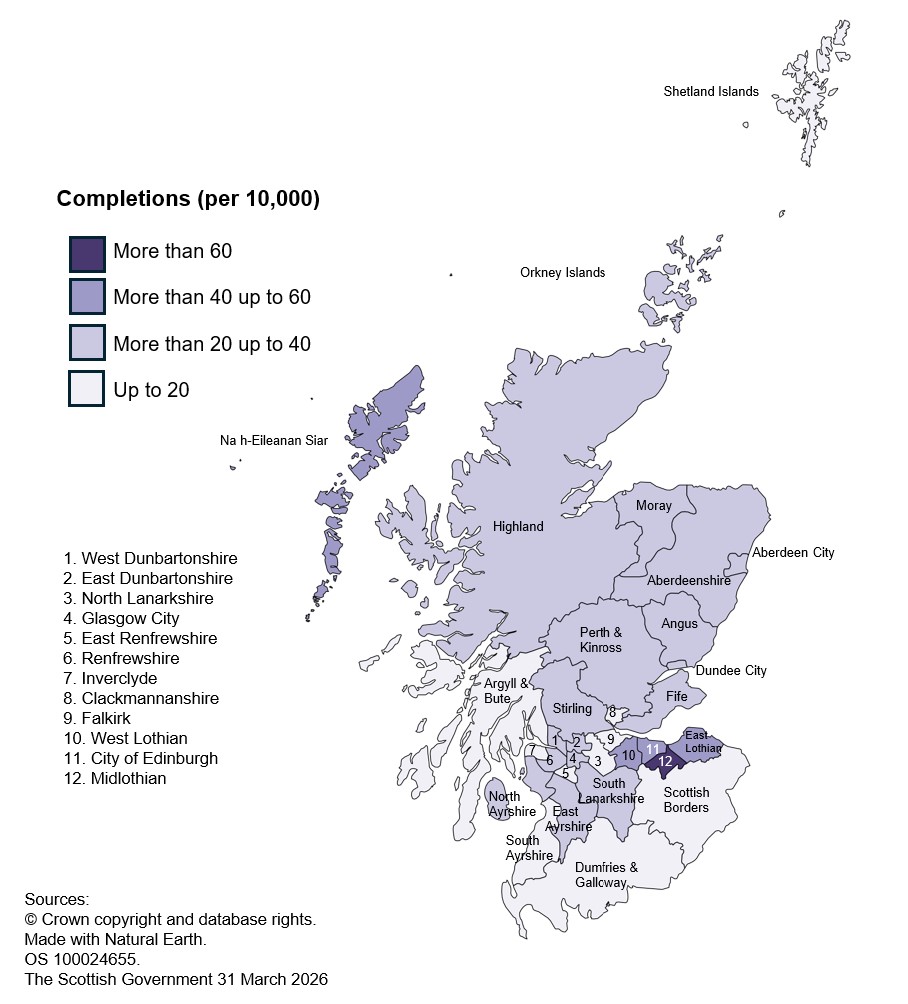 Note that all-sector completion rates calculations contain some estimated figures for East Dunbartonshire, South Ayrshire, and Stirling. Further details are in the Data and Methodology section.