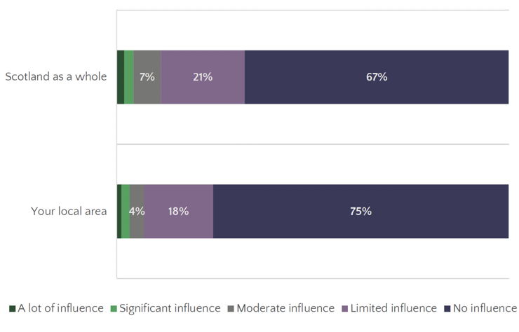 Only a very small proportion of respondents believed that they have a more than limited influence on decision-making in Scotland as a whole (11%) or their local area (7%).