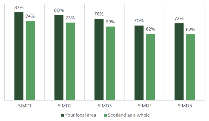 Looking more closely at those who feel they have no influence over decision making, there were some notable demographic differences in opinion (Figure 5.2). In particular, those from the most deprived neighbourhoods – SIMD 1 and 2 – were most likely to report that they have no influence over decision-making, either at a national or local level. 83% of those in SIMD 1 said they have no influence over decision-making in their local area, while 74% said they have no influence over decision-making in Scotland as a whole. In contrast, these percentages fell to 72% and 62% respectively for those in the least deprived neighbourhoods – SIMD 5.