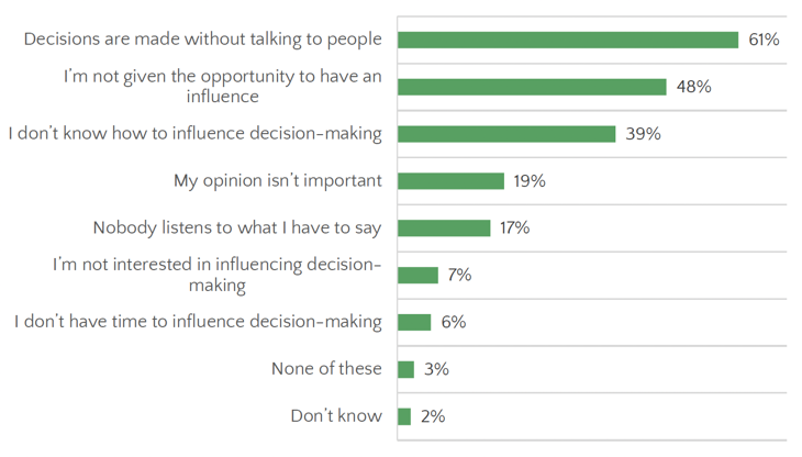 Of those who felt like they have limited or no influence over decision-making, a small minority reported that they are not interested in influencing decision-making (7%) or that they do not have time to influence decision-making (6%).