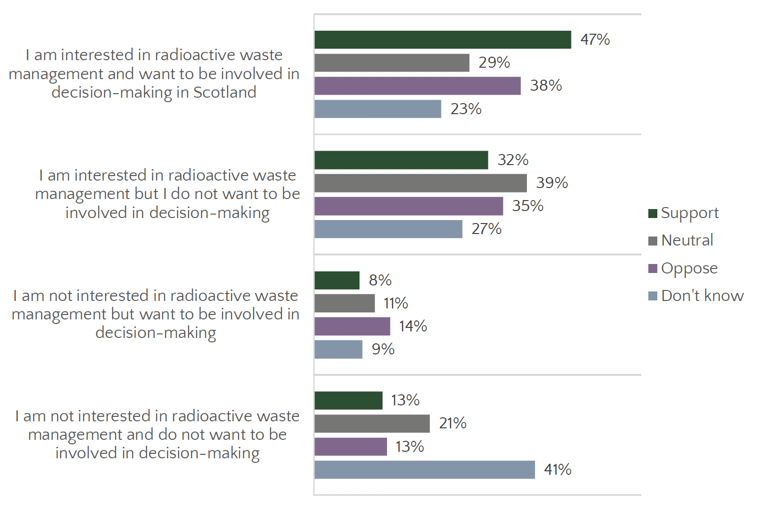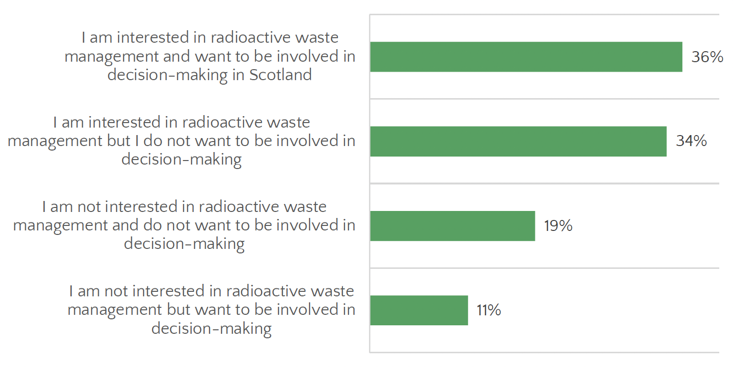 Results from the survey showed a strong interest in radioactive waste management (Figure 5.4). Overall, 70% of the respondents reported that they were interested in radioactive waste management. However, this majority was split by desire to be involved in decision-making in Scotland; one third (36%) of the respondents were interested in radioactive waste management and want to be involved in decision-making in Scotland, while another third (34%) were interested but do not want to be involved in decision-making.