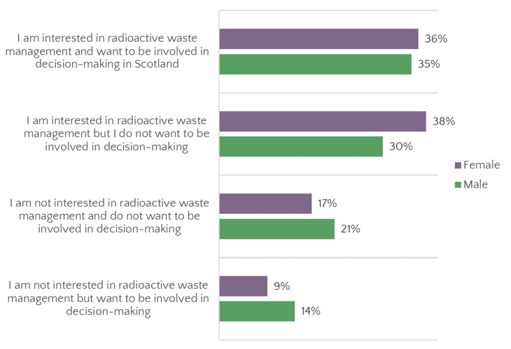 Key demographic differences emerged in relation to interest and desire to be involved in decision-making about managing radioactive waste (Figure 5.5). In particular, females (38%) were more likely than males (38%) to select that they are interested in radioactive waste management but do not want to be involved in decision making. In contrast, males were more likely to say they are not interested in radioactive waste management but want to be involved in decision-making (14%) than females (9%).