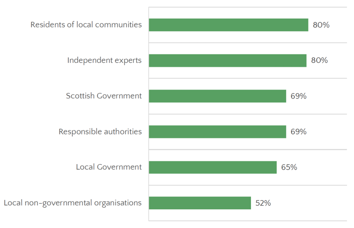 Over two thirds believed the Scottish Government (69%), the responsible authorities (69%) and the local government (65%) should be involved in the decision-making process for new facilities in Scotland. Over half (52%) believed local non-governmental organisations should be included.