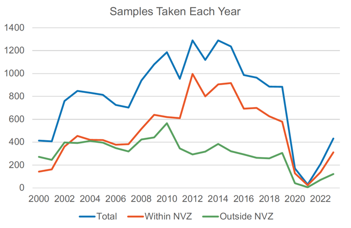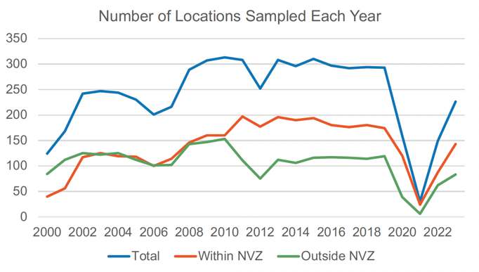 Figure 2.4 shows the percentage of sites split by nitrate concentration thresholds and locations inside and outside the NVZs to appreciate possible changes that could be attributed to the application of diffuse pollution reduction measures. Figure 2.4 shows that there is a greater reduction in the percentage of sites with concentrations above 37.5mg/l within the NVZ than outside, with a greater reduction in sites above 50mg/l (Figure 2.4 (f)) albeit this appears to be stalling in the last four years possibly due to the reduction in the number of samples collected during the Covid-19 pandemic (see Figure 2.1).