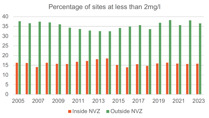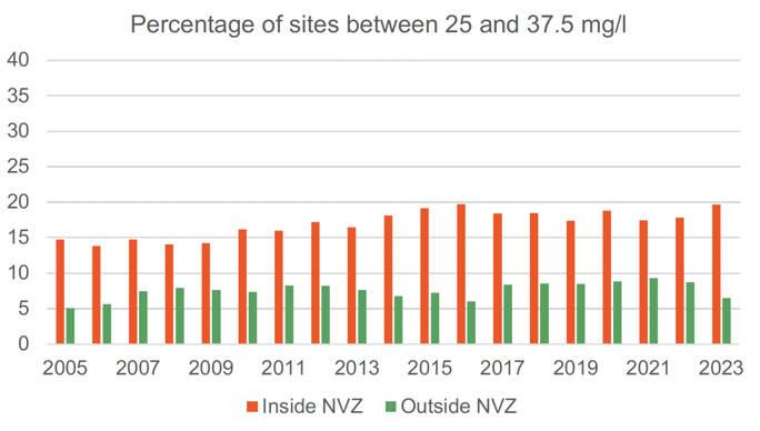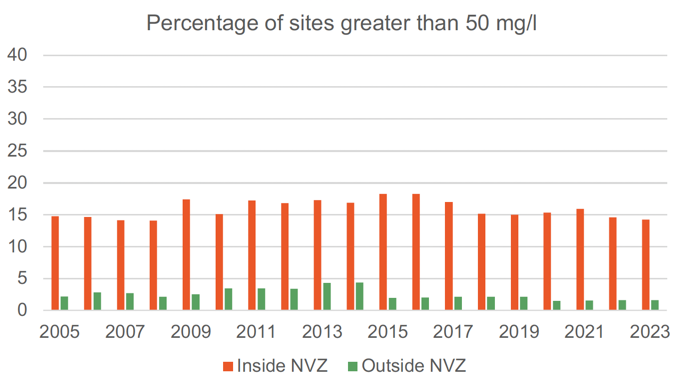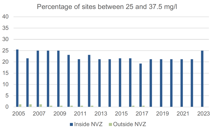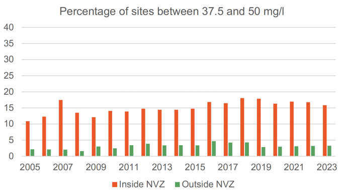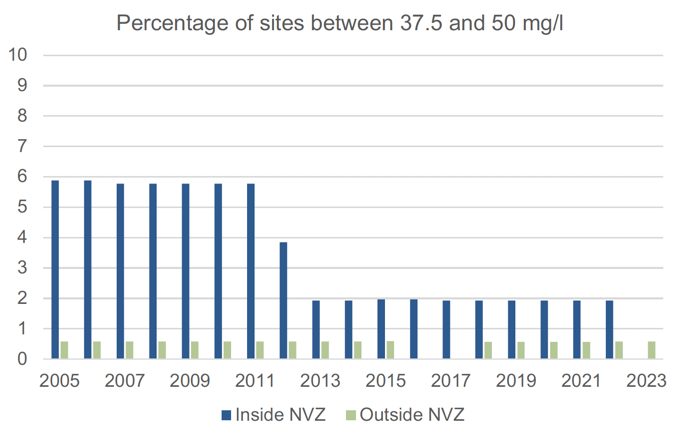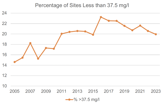 Figure 2.3 – Percentage of sites above the classification threshold of 37.5 mg/l in each year between 2005 and 2023.