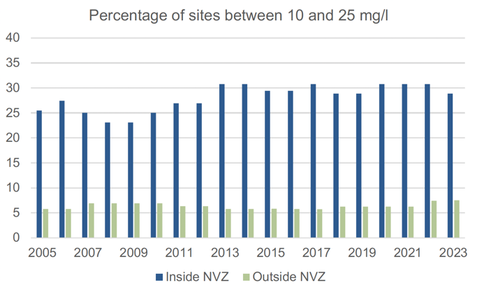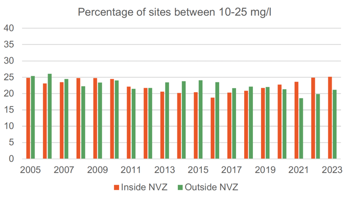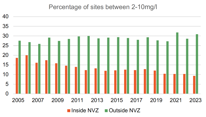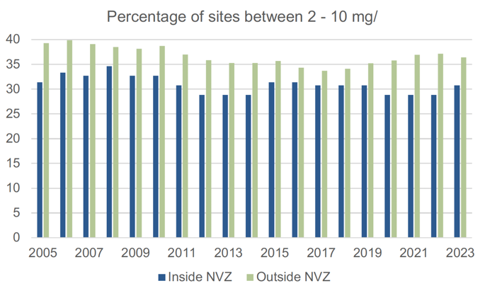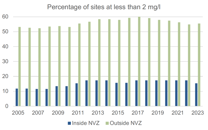 Table 2.5 provides a summary of the changes in average nitrate concentration at sampling points between previous (2016-2019) and current (2020-2023) reporting periods. While the picture is largely stable, Table 2.5 does suggest the largest decreases occurred at sites within NVZs, although there are also some increases at sites both within and outwith NVZs, as would be expected.