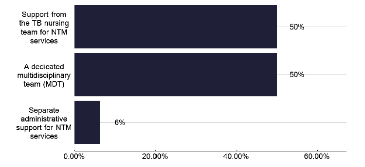 Issues with NTM were apparent during the review with some 38% of TB services, setting up NTM services within the actual TB clinic, to cohort the patients into one service, as shown in graph 264 in the data pack in Annex E. While beneficial, this may have an impact on the capacity to deliver standard TB care, as in half of the NTM services it is the TB nurses who are involved, as shown in Figure 57. This is necessary to support patients, but NTM represents a significant volume of work for some services, as shown in Figure 58, where two services have seen over 50 NTM patients in the last year, and one third of services are unsure of the number of cases seen.