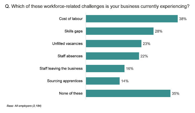 Almost two-thirds of employers (65%) were experiencing workforce related challenges. The most common challenge was the cost of labour (38%), followed by skills gaps (28%), unfilled vacancies (23%) and staff absences (22%).