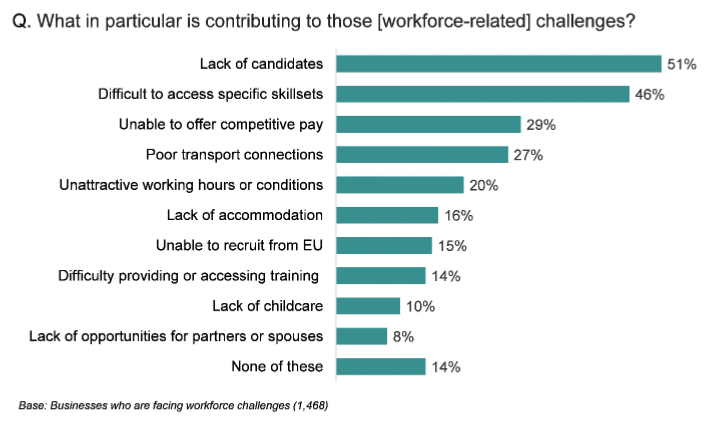 - Tourism – poor transport connections (38%), unattractive working hours or conditions (36%), unable to recruit from EU (28%), lack of accommodation (24%), lack of childcare (18%).