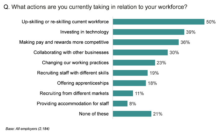 The top actions employers were taking in relation to their workforce were: upskilling or re-skilling current workforce (50%), investing in new technology (39%), making pay and rewards more competitive (36%) and collaborating with other businesses (30%).