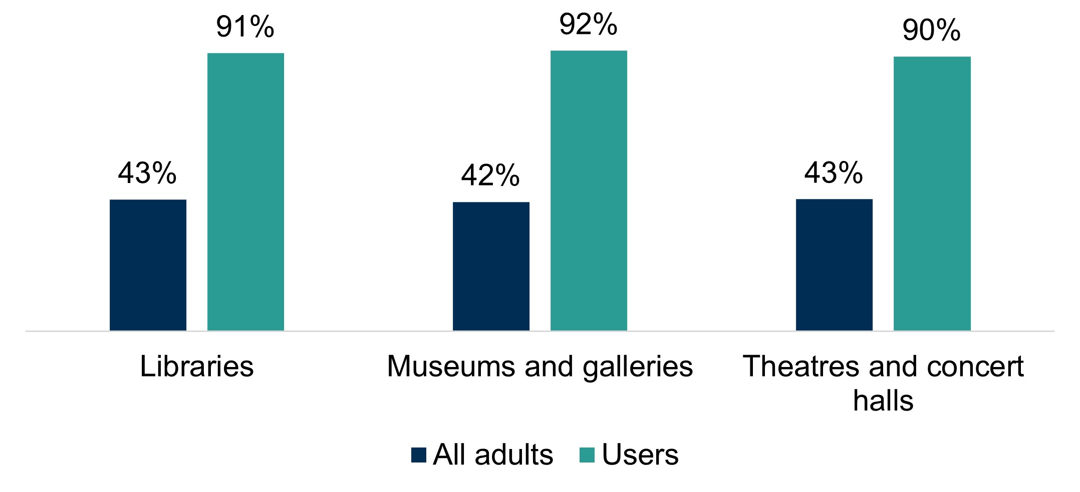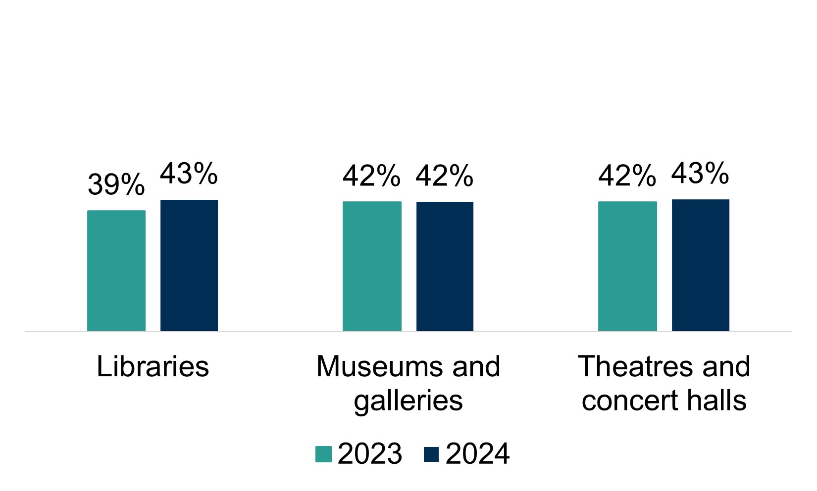 The latest data (2024) from SHS shows us that, just over two in five adults were satisfied with local authority libraries (43%), museums and galleries (42%), and theatres and concert halls (43%).