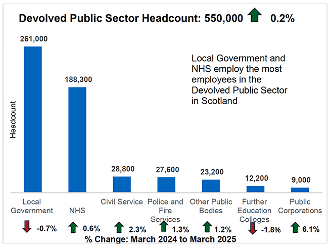 Source: Infographic taken from Public Sector Employment in Scotland Statistics for Quarter 1 2025.[71] Numbers rounded to the nearest 100.