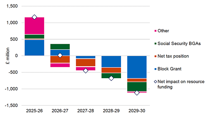 The main reason for the decreased funding from 2027-28 onwards relates to the expenditure forecast for Personal Independence Payment (PIP) and Carer’s Allowance in England and Wales being revised downwards as a direct result of the welfare reforms announced by the UK Government in the 2025 Spring Statement.