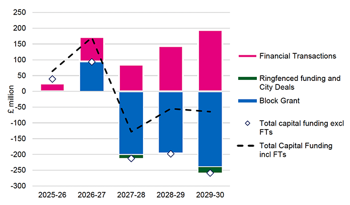 Total capital funding, including FTs, is expected to remain broadly constant in nominal terms and fall by 1.8 per cent a year in real terms over this period. Within this the capital Block Grant is set to fall in real terms, while FTs are set to increase in both nominal and real terms.