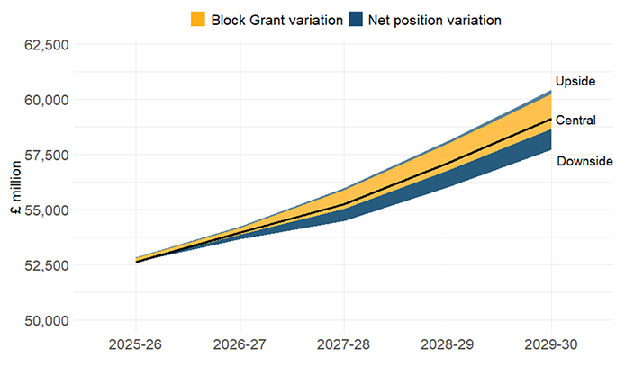 The Block Grant forecast presented incorporates the outcome of the UK Government’s Spending Review on 11 June 2025. While this increases the level of certainty in the funding outlook, other drivers of uncertainty remain. Therefore, the chapter also includes potential alternative scenarios, setting out a more optimistic and pessimistic outlook.