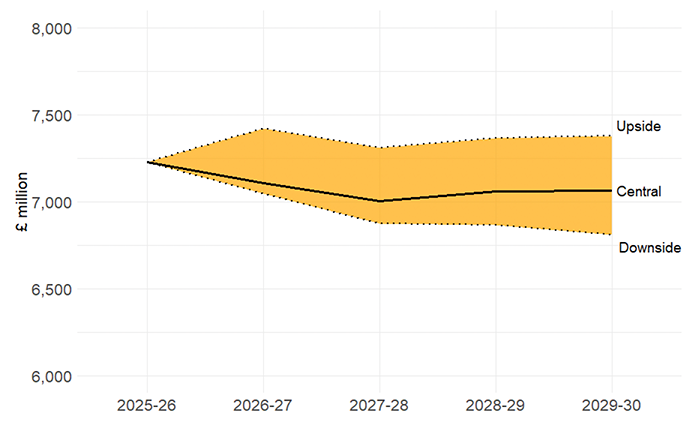 This section presents illustrative upside and downside scenarios for the funding envelope to demonstrate the scale of possible outcomes, with further detail of these set out in Annex B. Other elements of funding not considered in this modelling may also lead to divergence from the central scenario over time.