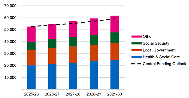 We take the 2025-26 Scottish Budget as the baseline position for resource spending and apply specific growth assumptions to each of the different areas of spend, as set out in Section 3.3 Resource Spending Outlook. When combined, resource spending increases from £52.6 billion[32] in 2025-26 to £61.7 billion in 2029-30.