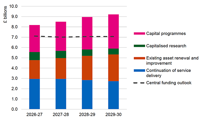 This further real-terms reduction is compounded by the real-term cuts in previous years and sustained high levels of inflation which reduced our spending power. As such our capital spending is forecast to exceed our available budget by £1.1 billion in 2026-27, rising to £2.1 billion in 2029-30 without further action. There are risks associated with these forecasts, for example, the significant public and private sector investment required to achieve a just transition to net zero.