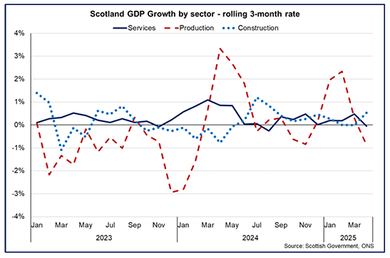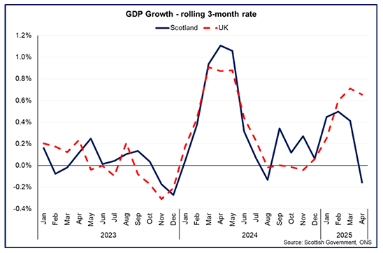 - Scotland's economic output contracted by 0.2% in April and more broadly fell by 0.2% in the three months to April (UK: 0.7%), with the pace of growth slowing from the first quarter.[1] Anecdotal evidence suggests that part of this pattern may reflect activity being brought forward in the year to avoid US tariffs.[2]