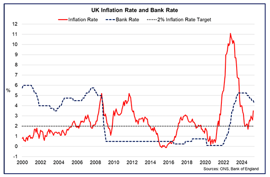 - In May, the Bank of England (BoE) forecast inflation to rise to 3.7% in September (3.5% on average over the third quarter) as a result of higher energy and water bills, the indexation of bills such as broadband and phone charges and the impact of higher employer NICs. From there, inflation is forecast to gradually fall back to around 2% by the start of 2027, though there remain risks in both directions to this forecast, including the current uncertainty surrounding global energy prices and the persistence of domestic factors.[5] Reflecting this, the Bank’s Monetary Policy Committee held the Bank Rate unchanged at 4.25% in June, following its 25 basis point cut in May and is consistent with its gradual approach to loosening monetary policy over the past year.[6]