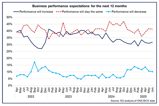 - Furthermore, latest BICS data for June shows that the greatest share of businesses (41.3%) continue to expect their business performance to stay the same over the next 12 months while the share of businesses expecting their performance to improve increased slightly in June to 31.7% while the share of businesses expecting performance to decrease (10.3%) continued to ease back from higher rates earlier in the year.