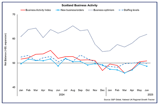 - The RBS Growth Tracker business survey reported that private sector business activity grew for a second consecutive month in June following a six month period of contraction. The Business Activity Index rose to 50.9 (a reading above 50 indicates growing activity) indicating that the pick-up in growth remains modest.[7]