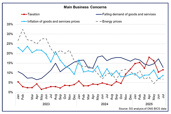 - Key business concerns during 2025 have been falling demand and taxation, followed by inflation and energy prices. The latest Business Insights and Conditions Survey (BICS) for July shows that demand for goods and services continues to be the most commonly cited main concern by businesses in Scotland (12.8%), though its share fell from 17.3% in June to its lowest level since April 2024.[8]