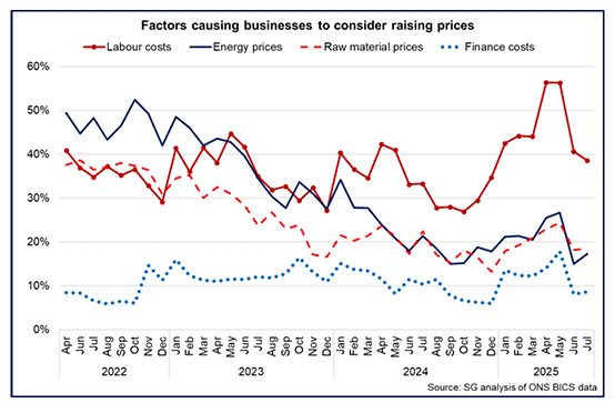 - The combination of cost challenges alongside concerns of falling demand continues to present challenging business conditions for considering the extent to which to absorb increased costs or to pass them through to customers, and is sector specific. The SCC Quarterly Economic Indicator for Q2 2025 reported that an increased share of businesses (65%) anticipate that they will be increasing prices in the next quarter.[13] The Bank of England Agent’s Summary of Business Conditions for Q2 2025 reported that the pass-through of higher labour and Extended Producer Responsibility costs introduced in April is, to date, more advanced in goods than in consumer services at a UK level.[14]