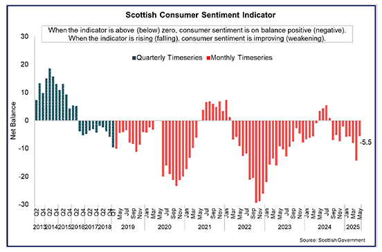 - Consumer sentiment strengthened in May, albeit from relative weakness in April, following a period of declining sentiment since during the second half of 2024. In May, the Scottish Consumer Sentiment Indicator rose by 8.9 points to ‑5.5, its highest net balance since December.[25]