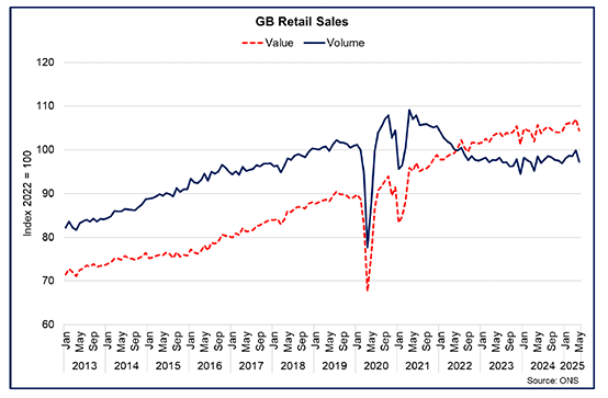 - At a GB level, retail sales growth slowed over the three months to May, rising by 0.8% in volume terms (0.4% in value terms), with the pace of volume growth slowing from March and April, but remaining stronger than through the turn of the year. Both measures grew by 1.7% on an annual basis.[27]