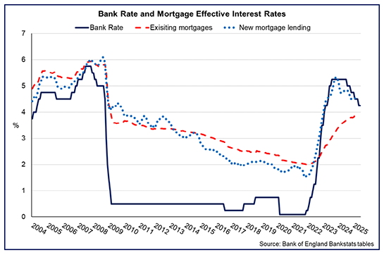 - As the gradual loosening of monetary policy feeds through into economic activity, latest Bank of England data for May show that the effective interest rate on the total stock of mortgages (new and existing) has risen marginally, from 3.86% in April to 3.87% in May, with the effective interest rate on new mortgages falling slightly from 4.49% to 4.47%. At the end of June, an average 2-year 75% loan-to-value mortgage offered a rate of 4.32%, up from 4.19% in May. This is the second lowest rate as tracked by the Bank since the end of September 2022, indicating that the pass-through of lower interest rates on the economy is gradually resulting in lower borrowing and mortgage costs for some households.