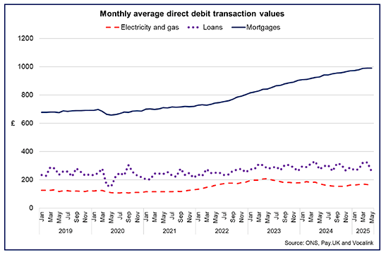 - In May, the average direct debit for mortgages was relatively stable at £989.82, up from £989.58 in April, while the average monthly loan direct debit has fallen from £322.47 to £259.84 over the same period.