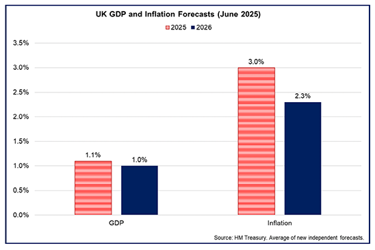 - Overall, growth is forecast to slow this year at a global and domestic level. Most recently, in June, the OECD forecast global growth to slow from 3.3% in 2024 to 2.9% in 2025 and 2026. At a UK level, the latest HMT average of new independent UK forecasts shows that UK GDP growth is expected to moderate slightly to 1.1% in 2025 before slowing to 1% in 2026 while inflation is expected to average above target in 2025 and gradually ease back in 2026.[28], [29]
