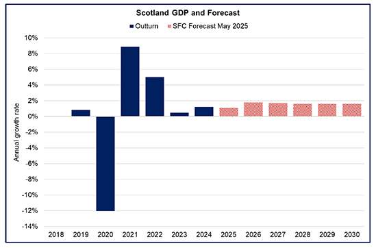 - In Scotland, in May, the Scottish Fiscal Commission (SFC) forecast Scottish GDP growth to slow to 1.1% in 2025, down from 1.2% in 2024, before rising to 1.8% in 2026 and 1.7% in 2027. This is a more moderate outlook for growth than previously forecast in December, reflecting a similar pattern of downward revisions to UK and global growth forecasts.[30]
