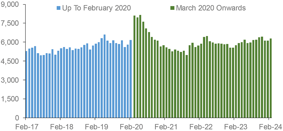 Data from the UK Government (also illustrated in Chart 11.3) shows that the annual growth rate in the cost of construction materials used in new house building, which had reached as high as 24.0% in June 2022, and thus contributed significantly to output-price inflation for new housing, has fallen sharply to 0.5% in January 2024. There is significant variation around this average with the highest price increases recorded for pipes and fittings (21.1%) and the lowest for steel concrete reinforcing bars (-18.2%).