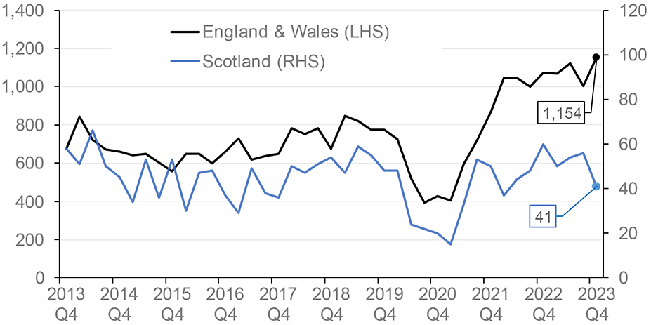 Chart 11.2 shows that during the pandemic insolvencies of construction companies registered in Scotland fell from 48 in Q1 2020 to 15 in Q1 2021, with a similar proportional fall evident for England and Wales, likely due to the business support in place. Subsequently, with this support unwinding, new-build construction-output prices increasing (as shown in Chart 11.3) and cost-of living pressures potentially impacting demand, there was an increase in insolvencies for construction companies registered in Scotland. However, latest calendar year data suggest that the number of insolvencies in Scotland has levelled off at around pre-pandemic levels: there were 201 insolvencies in 2023, which is similar to the number of insolvencies in 2019 (209).