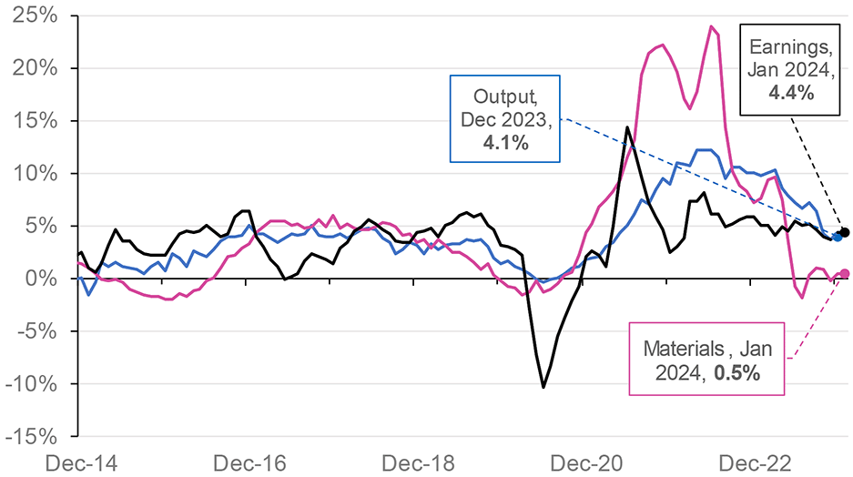 ONS construction-output price data shows that the index for new housing, which covers a range of costs (including earnings) associated with building new public and private housing, increased by an annual 4.1% in December 2023, falling from a peak of 12.2% in June 2022 (Chart 11.3).