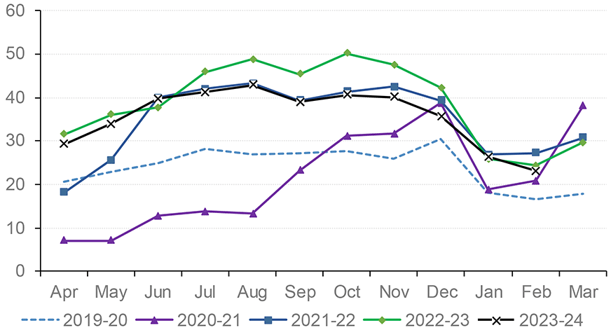 However, the recent decline in transactions has led to revenue for the first eleven months of 2023-24 being 10% less than the corresponding months of 2022-23, although it was still 46% higher than the corresponding months of 2019-20.