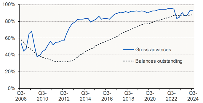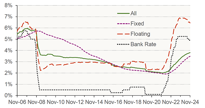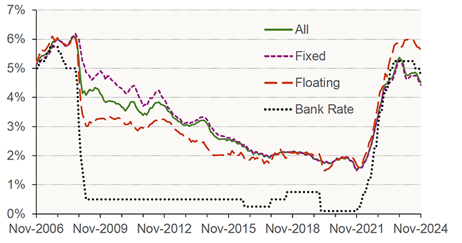 As the vast majority of borrowers are on fixed-rate mortgages (see Chart 6.4), the average rate on all outstanding mortgages at the end of November 2024 (3.81%) was only a little higher than the average rate on fixed-rate outstanding mortgages (3.48%). A similar pattern applies to new mortgages, as the figures set out earlier show.