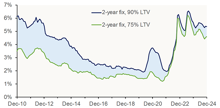 Bank of England data on advertised mortgage rates (as opposed to data in Chart 6.1 which is based on interest actually paid), also shows that, despite a small recent uptick, mortgage rates have been on a general downward trend: the average advertised two-year fixed rate for a 75% LTV mortgage has fallen from 5.19% in May 2024 to 4.60% in December 2024, while for a 90% LTV the average rate has fallen from 5.66% to 5.36% over the same period. Due to the slightly larger fall in the 75% LTV rate, the spread between the two LTV values has widened slightly over this period (from 0.47 percentage points to 0.76 percentage points).