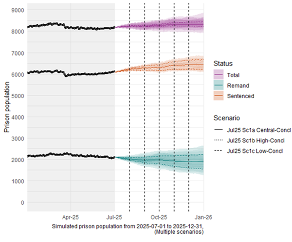 On 1st July 2025, the total prison population was 8,202. The overall projected range for the average daily prison population in December 2025 is between 7,950 and 8,750. The modelling indicates it is likely that the overall prison population in Scotland will increase between the beginning of July 2025 and the end of December 2025.