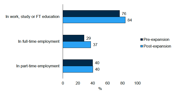 When looking specifically at mothers in employment, however, the proportion in the lowest income group who were employed full-time remained the same (27% both pre- and post-expansion). However, the proportion of those in employment in the moderate/high income group who were in full-time employment rose from 43% to 51%.